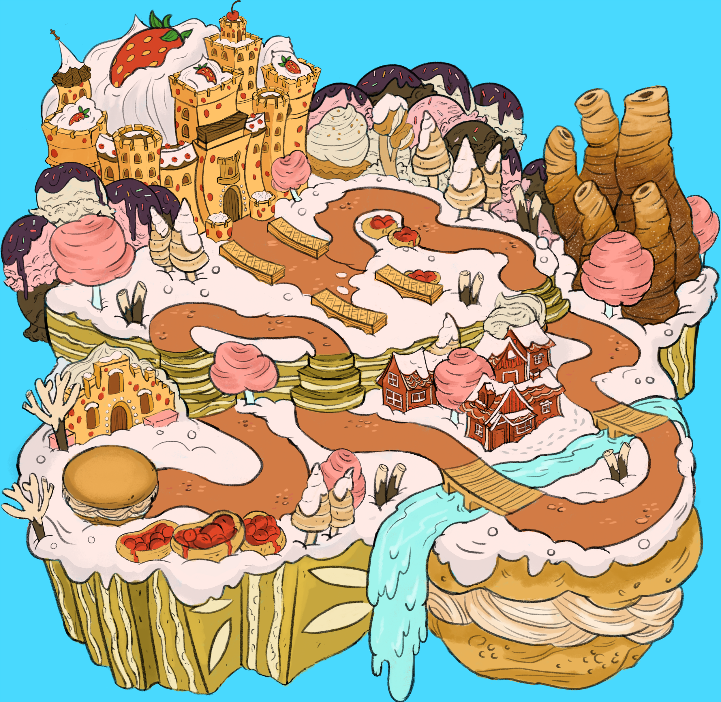 Maps created for Jam City’s mobile game Cookie Jam. Both maps feature desserts from the designated city and famous architecture interwoven within the local desserts.